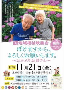 2025.10.21 第5回地域福祉映画会のお知らせ 第5回地域福祉映画会「ぼけますから、よろしくお願いします。~おかえりお母さん~」のお知らせ ●日時:2025 年 11 月 21 日(金)【2回上映】 1回目 13:00~(受付 12:30~) 2回目 16:00~(受付 15:30~) ●上映時間:102 分【日本語字幕付き】 ●上映会場:大阪市社会福祉研修・情報センター 5F (大阪市西成区出城 2-5-20) ●先着各回80名(申込不要)無料です。 *詳細はこちら*